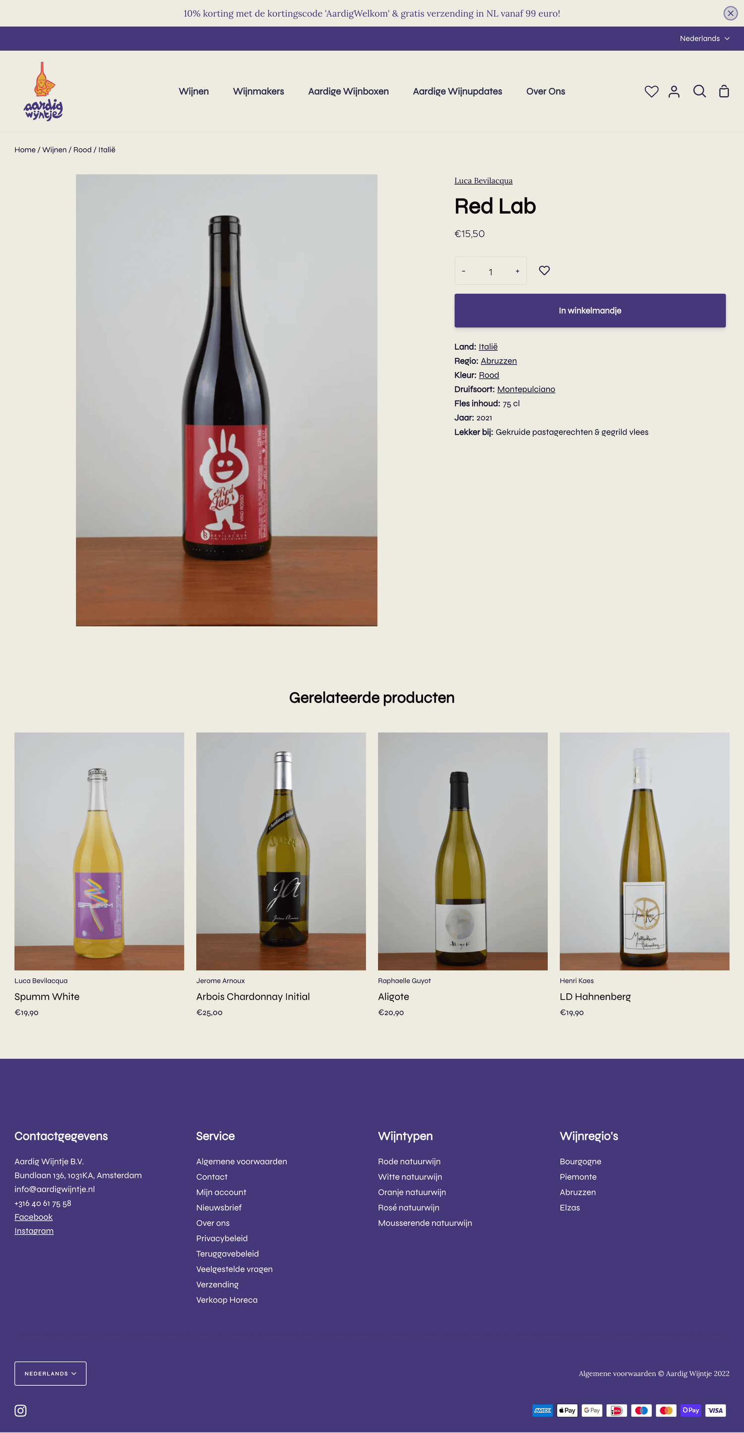 In de webshop is gemakkelijk te zoeken op wijnsoort, land, regio, druifsoort of wijnmaker voor een perfecte match. Kies voor een fles of ga voor een wijnbox met daarin verschillende soorten natuurlijke wijnen om te proberen.
