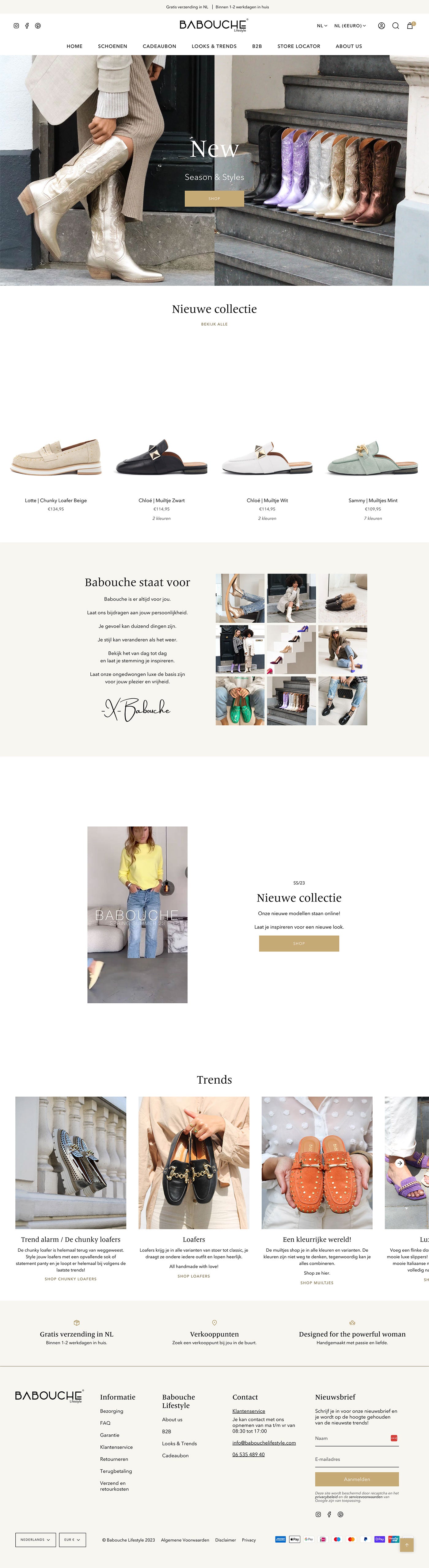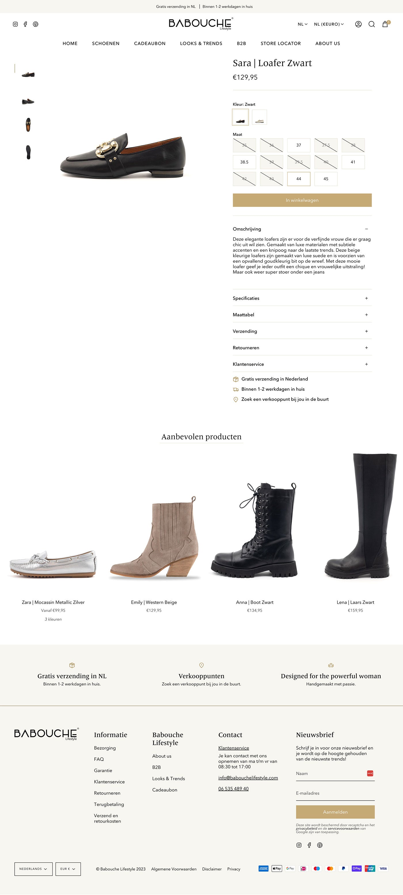 Babouche Lifestyle is in 2018 opgericht en is een schoenenmerk gespecialiseerd in grote en kleine maten. Bijna alle producten zijn namelijk beschikbaar van maat 36 tot en met maat 45. Naast dat ze via hun eigen B2C webshop schoenen verkopen leveren ze ook aan winkeliers via de B2B webshop en hebben ze ondertussen wereldwijd fysieke verkooppunten.